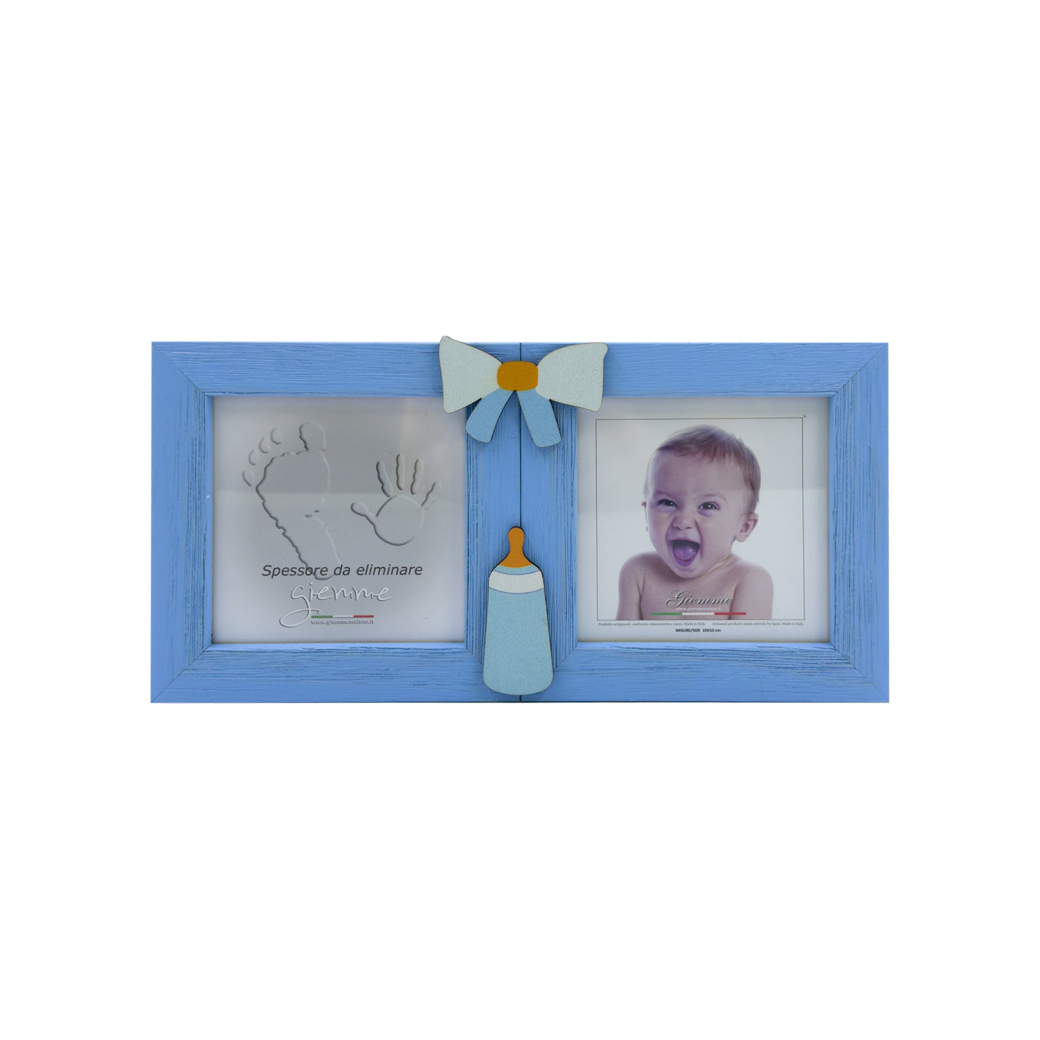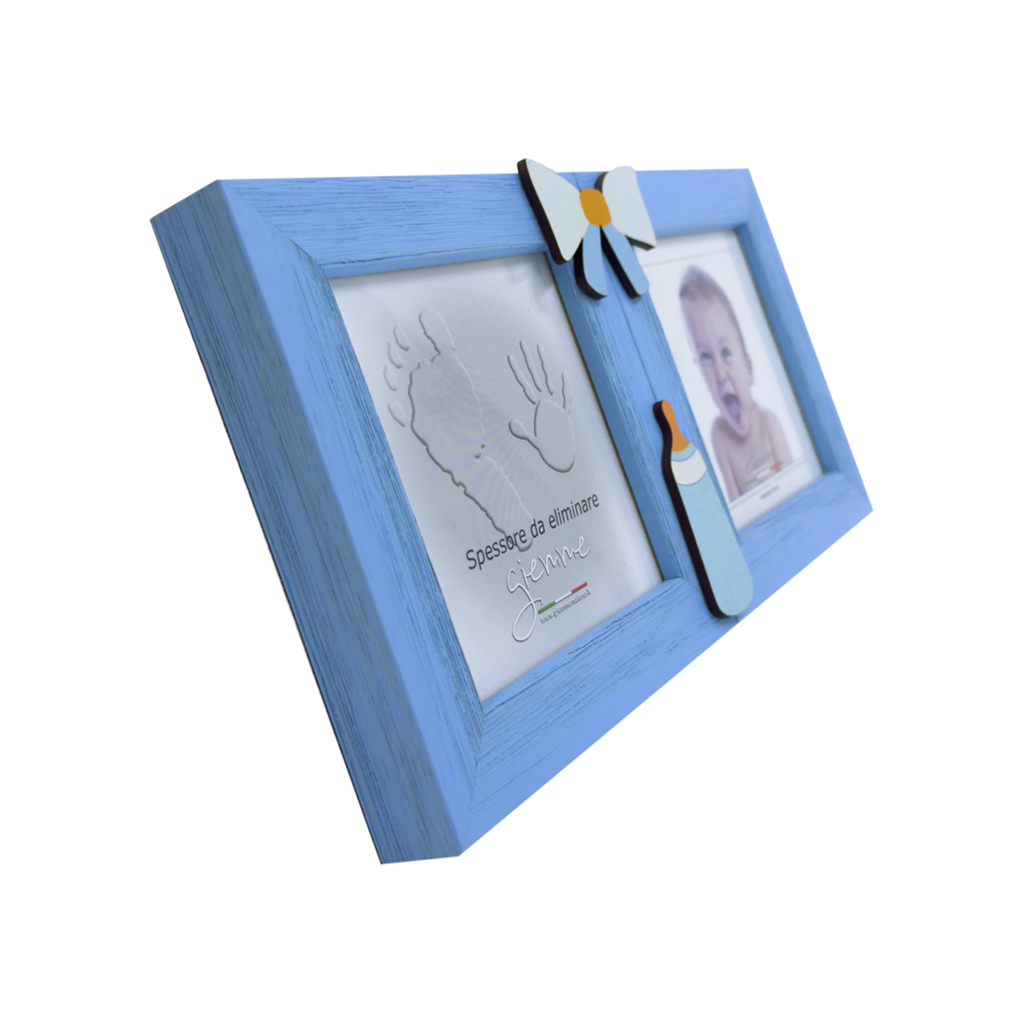 Cornice bimbo multipla da appoggio in legno celeste, con impronta mano o piede